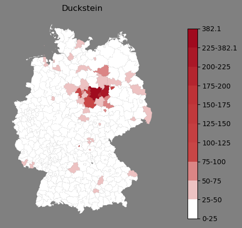 Relative Verteilung des Namens Duckstein (1996)Direkt zur Karte Die Farbskala zeigt die Anzahl von "Duckstein" bezogen auf je 1 Million Einträge. |