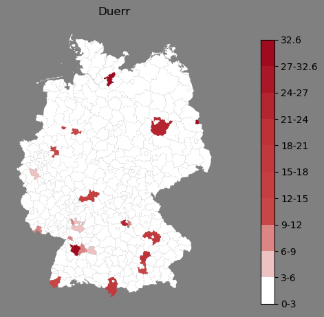 Relative Verteilung des Namens Duerr (1996)Direkt zur Karte Die Farbskala zeigt die Anzahl von "Duerr" bezogen auf je 1 Million Einträge. |