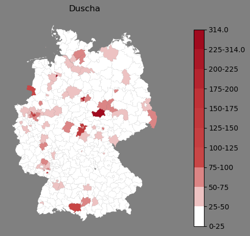 Relative Verteilung des Namens Duscha (1996)Direkt zur Karte Die Farbskala zeigt die Anzahl von "Duscha" bezogen auf je 1 Million Einträge. |
