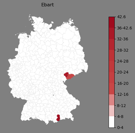Relative Verteilung des Namens Ebart (1996)Direkt zur Karte Die Farbskala zeigt die Anzahl von "Ebart" bezogen auf je 1 Million Einträge. |