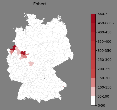 Relative Verteilung des Namens Ebbert (1996)Direkt zur Karte Die Farbskala zeigt die Anzahl von "Ebbert" bezogen auf je 1 Million Einträge. |