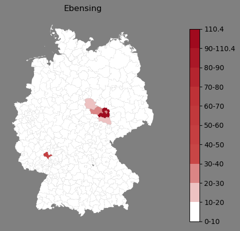 Absolute Verteilung des Namens Ebensing (1890)Direkt zur Karte Absolute Verteilung des Namens "Ebensing" um 1890 im damaligen Deutschen Reich Sie können die Karte innerhalb des Fensters zoomen und verschieben. |