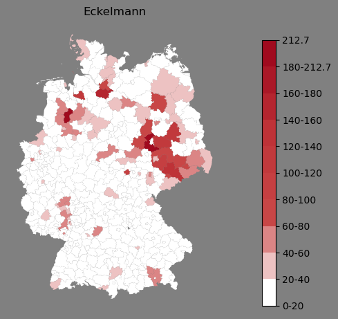 Relative Verteilung des Namens Eckelmann (1996)Direkt zur Karte Die Farbskala zeigt die Anzahl von "Eckelmann" bezogen auf je 1 Million Einträge. |