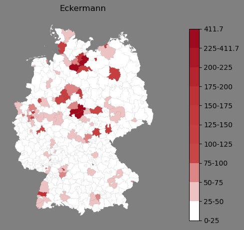 Absolute Verteilung des Namens Eckermann (1890)Direkt zur Karte Absolute Verteilung des Namens "Eckermann" um 1890 im damaligen Deutschen Reich Sie können die Karte innerhalb des Fensters zoomen und verschieben. |