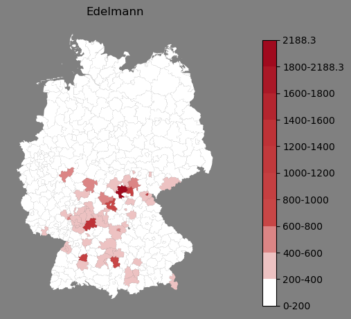 Relative Verteilung des Namens Edelmann (1996)Direkt zur Karte Die Farbskala zeigt die Anzahl von "Edelmann" bezogen auf je 1 Million Einträge. |