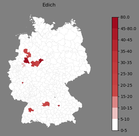 Relative Verteilung des Namens Edich (1996)Direkt zur Karte Die Farbskala zeigt die Anzahl von "Edich" bezogen auf je 1 Million Einträge. |