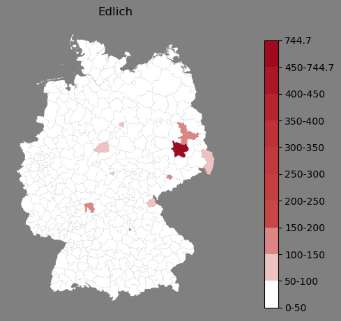 Relative Verteilung des Namens Edlich (1996)Direkt zur Karte Die Farbskala zeigt die Anzahl von "Edlich" bezogen auf je 1 Million Einträge. |