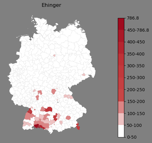 Absolute Verteilung des Namens Ehinger (1890)Direkt zur Karte Absolute Verteilung des Namens "Ehinger" um 1890 im damaligen Deutschen Reich Sie können die Karte innerhalb des Fensters zoomen und verschieben. |