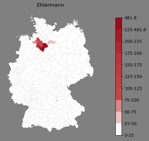 Absolute Verteilung des Namens Ehlermann (1890)Direkt zur Karte Absolute Verteilung des Namens "Ehlermann" um 1890 im damaligen Deutschen Reich Sie können die Karte innerhalb des Fensters zoomen und verschieben. |