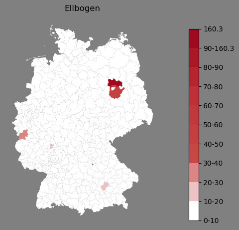 Absolute Verteilung des Namens Ellbogen (1890)Direkt zur Karte Absolute Verteilung des Namens "Ellbogen" um 1890 im damaligen Deutschen Reich Sie können die Karte innerhalb des Fensters zoomen und verschieben. |
