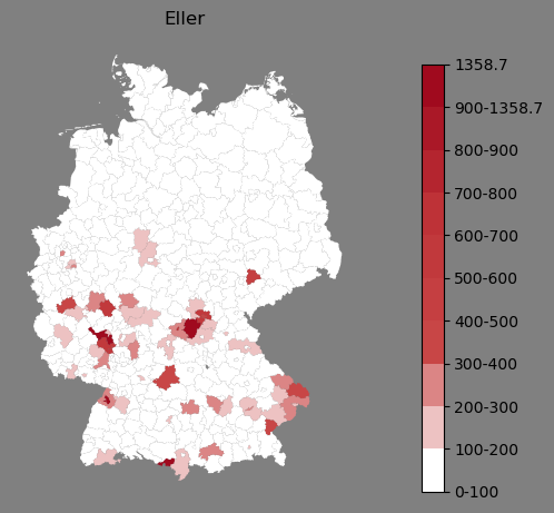 Relative Verteilung des Namens Eller (1996)Direkt zur Karte Die Farbskala zeigt die Anzahl von "Eller" bezogen auf je 1 Million Einträge. |