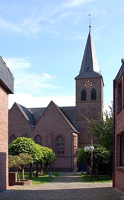 Herrnhaus der Familie von Elmpt, im Hintergrund St. Laurentius