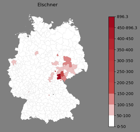 Relative Verteilung des Namens Elschner (1996)Direkt zur Karte Die Farbskala zeigt die Anzahl von "Elschner" bezogen auf je 1 Million Einträge. |