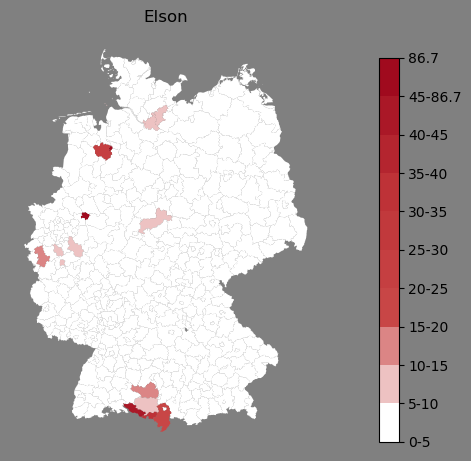 Absolute Verteilung des Namens Elson (1890)Direkt zur Karte Absolute Verteilung des Namens "Elson" um 1890 im damaligen Deutschen Reich Sie können die Karte innerhalb des Fensters zoomen und verschieben. |