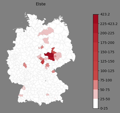 Relative Verteilung des Namens Elste (1996)Direkt zur Karte Die Farbskala zeigt die Anzahl von "Elste" bezogen auf je 1 Million Einträge. |