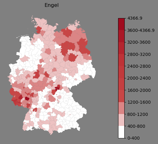 Absolute Verteilung des Namens Engel (1890)Direkt zur Karte Absolute Verteilung des Namens "Engel" um 1890 im damaligen Deutschen Reich Sie können die Karte innerhalb des Fensters zoomen und verschieben. |