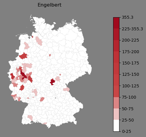 Absolute Verteilung des Namens Engelbert (1890)Direkt zur Karte Absolute Verteilung des Namens "Engelbert" um 1890 im damaligen Deutschen Reich Sie können die Karte innerhalb des Fensters zoomen und verschieben. |
