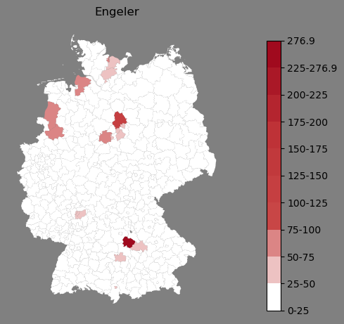 Relative Verteilung des Namens Engeler (1996)Direkt zur Karte Die Farbskala zeigt die Anzahl von "Engeler" bezogen auf je 1 Million Einträge. |