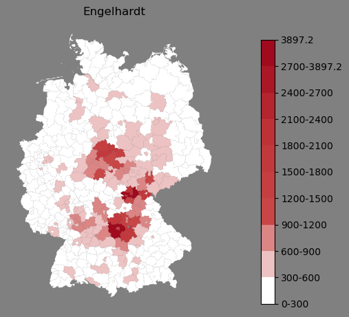 Absolute Verteilung des Namens Engelhardt (1890)Direkt zur Karte Absolute Verteilung des Namens "Engelhardt" um 1890 im damaligen Deutschen Reich Sie können die Karte innerhalb des Fensters zoomen und verschieben. |