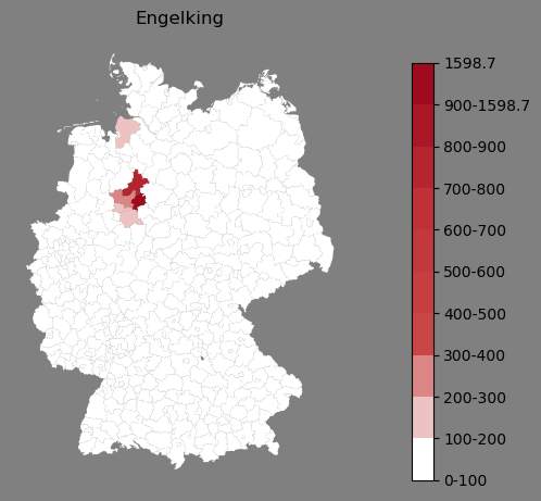 Absolute Verteilung des Namens Engelking (1890)Direkt zur Karte Absolute Verteilung des Namens "Engelking" um 1890 im damaligen Deutschen Reich Sie können die Karte innerhalb des Fensters zoomen und verschieben. |