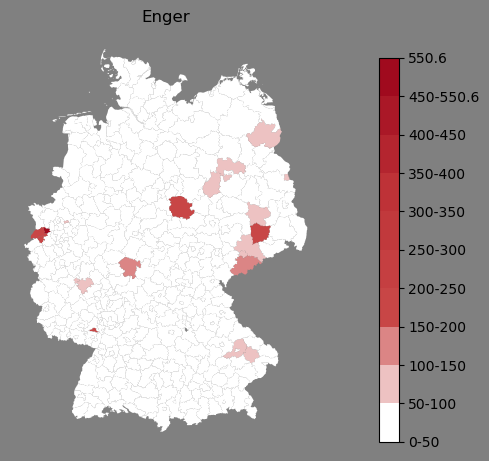 Relative Verteilung des Namens Enger (1996)Direkt zur Karte Die Farbskala zeigt die Anzahl von "Enger" bezogen auf je 1 Million Einträge. |