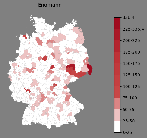 Relative Verteilung des Namens Engmann (1996)Direkt zur Karte Die Farbskala zeigt die Anzahl von "Engmann" bezogen auf je 1 Million Einträge. |
