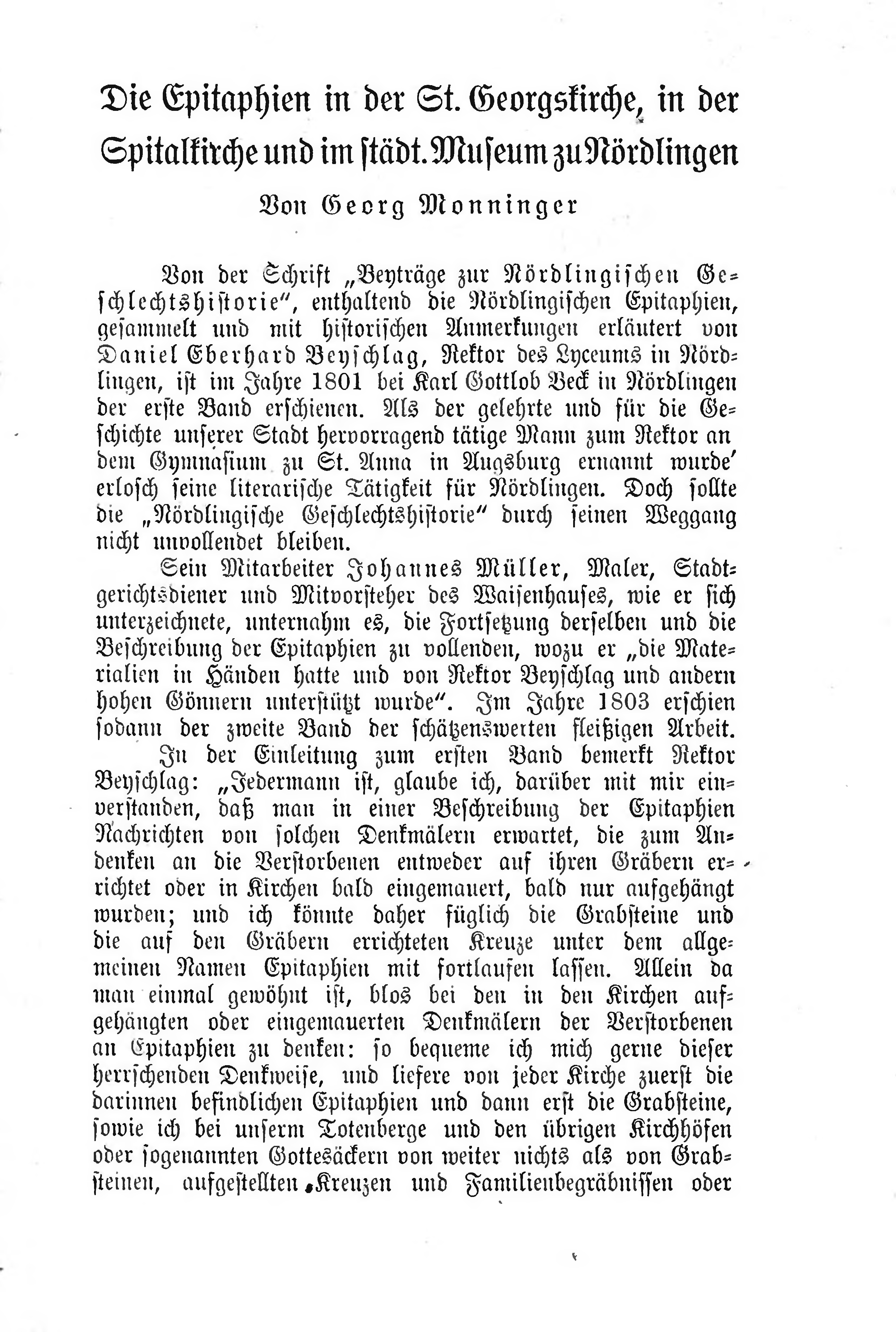 Von der Schrift „Beyträge zur Nördlingischen Geschlechtshistorie“, enthaltend die Nördlingischen Epitaphien, gesammelt und mit historischen Anmerkungen erläutert von Daniel Eberhard Beyschlag, Rektor des Lyceums in Nördlingen, ist im Jahre 1801 bei Karl Gottlob Beck in Nördlingen der erste Band erschienen. Als der gelehrte und für die Geschichte unserer Stadt hervorragend tätige Mann zum Rektor an dem Gymnasium zu St. Anna in Augsburg ernannt wurde erlosch seine literarische Tätigkeit für Nördlingen. Doch sollte die „Nördlingische Geschlechtshistorie“ durch seinen Weggang nicht unvollendet bleiben.