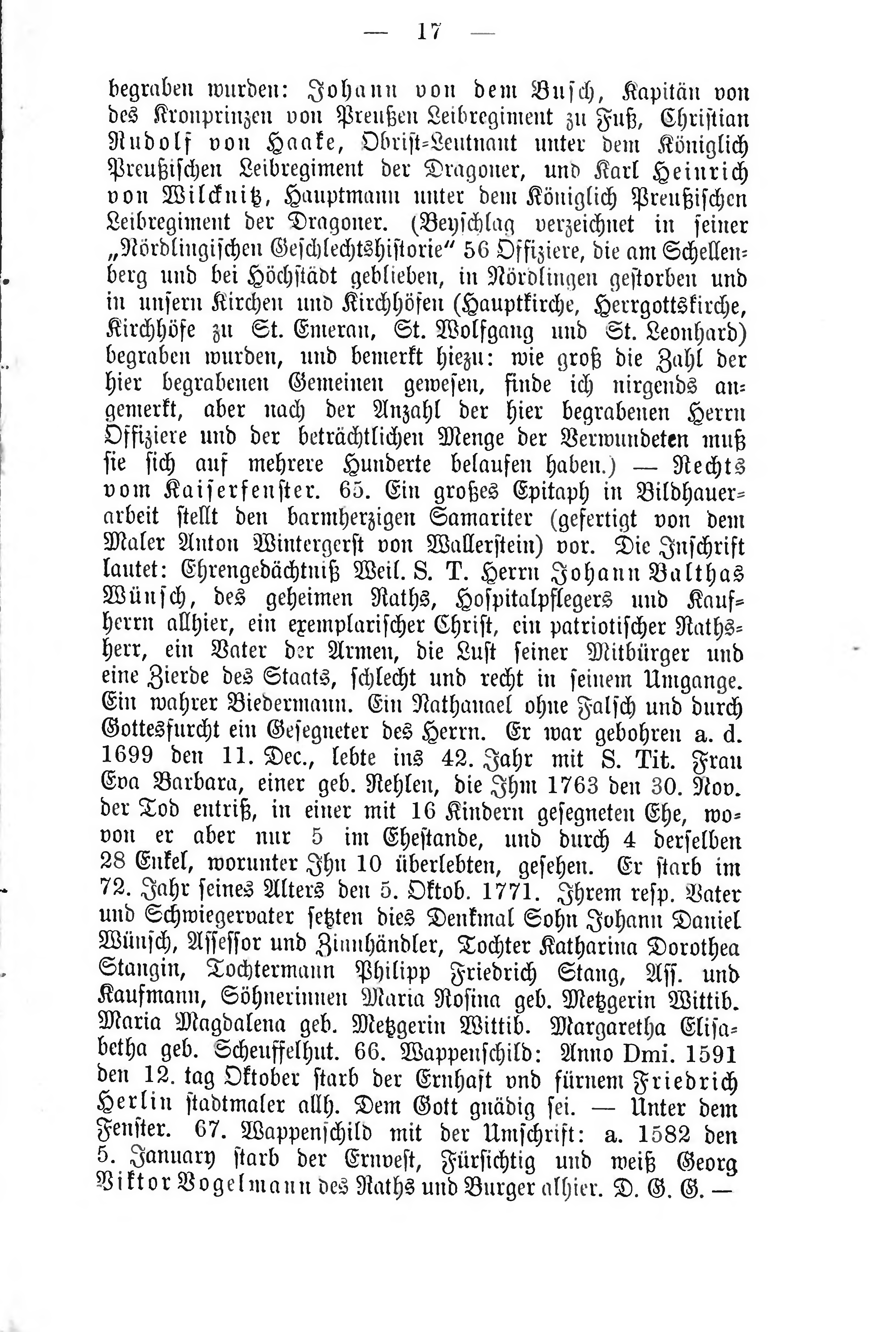 begraben wurden: Johann von dem Busch, Kapitän von des Kronprinzen von Preußen Leibregiment zu Fuß, Christian Rudolf von Haake, Obrist-Leutnant unter dem Königlich Preußischen Leibregiment der Dragoner, und Karl Heinrich von Wilcknitz, Hauptmann unter dem Königlich Preußischen Leibregiment der Dragoner. (Beyschlag verzeichnet in seiner „Nördlingischen Geschlechtshistorie“ 56 Offiziere, die am Schellenberg und bei Höchstädt geblieben, in Nördlingen gestorben und in unsern Kirchen und Kirchhöfen (Hauptkirche, Herrgottskirche, Kirchhöfe zu St. Emeran, St. Wolfgang und St. Leonhard) begraben wurden, und bemerkt hiezu: wie groß die Zahl der hier begrabenen Gemeinen gewesen, finde ich nirgends angemerkt, aber nach der Anzahl der hier begrabenen Herrn Offiziere und der beträchtlichen Menge der Verwundeten muß sie sich auf mehrere Hunderte belaufen haben.) – Rechts vom Kaiserfenster. 65. Ein großes Epitaph in Bildhauerarbeit stellt den barmherzigen Samariter (gefertigt von dem Maler Anton Wintergerst von Wallerstein) vor. Die Inschrift lautet: Ehrengedächtniß Weil. S. T. Herrn Johann Balthas Wünsch, des geheimen Raths, Hospitalpflegers und Kaufherrn allhier, ein exemplarischer Christ, ein patriotischer Rathsherr, ein Vater der Armen, die Lust seiner Mitbürger und eine Zierde des Staats, schlecht und recht in seinem Umgange. Ein wahrer Biedermann. Ein Nathanael ohne Falsch und durch Gottesfurcht ein Gesegneter des Herrn. Er war gebohren a. d. 1699 den 11. Dec., lebte ins 42. Jahr mit S. Tit. Frau Eva Barbara, einer geb. Rehlen, die Ihm 1763 den 30. Nov. der Tod entriß, in einer mit 16 Kindern gesegneten Ehe, wovon eer aber nur 5 im Ehestande, und durch 4 derselben 28 Enkel, worunter Ihn 10 überlebten, gesehen. Er starb im 72. Jahr seines Alters den 5. Oktob. 1771. Ihrem resp. Vater und Schwiegervater setzten dies Denkmal Sohn Johann Daniel Wünsch, Assessor und Zinnhändler, Tochter Katharina Dorothea Stangin, Tochtermann Philipp Friedrich Stang, Ass. und Kaufmann, Söhnerinnen Maria Rosina geb. Metzgerin Wittib. Maria Magdalena geb. Metzgerin Wittib. Margaretha Elisabetha geb. Scheuffelhut. 66. Wappenschild: Anno Dmi. 1591 den 12. tag Oktober starb der Ernhaft und fürnem Friedrich Herlin stadtmaler allh. Dem Gott gnädig sei. – Unter dem Fenster. 67. Wappenschild mit der Umschrift: a. 1582 den 5. January starb der Ernvest, Fürsichtig und weiß Georg Viktor Vogelmann des Raths und Burger allhier. D. G. G. –