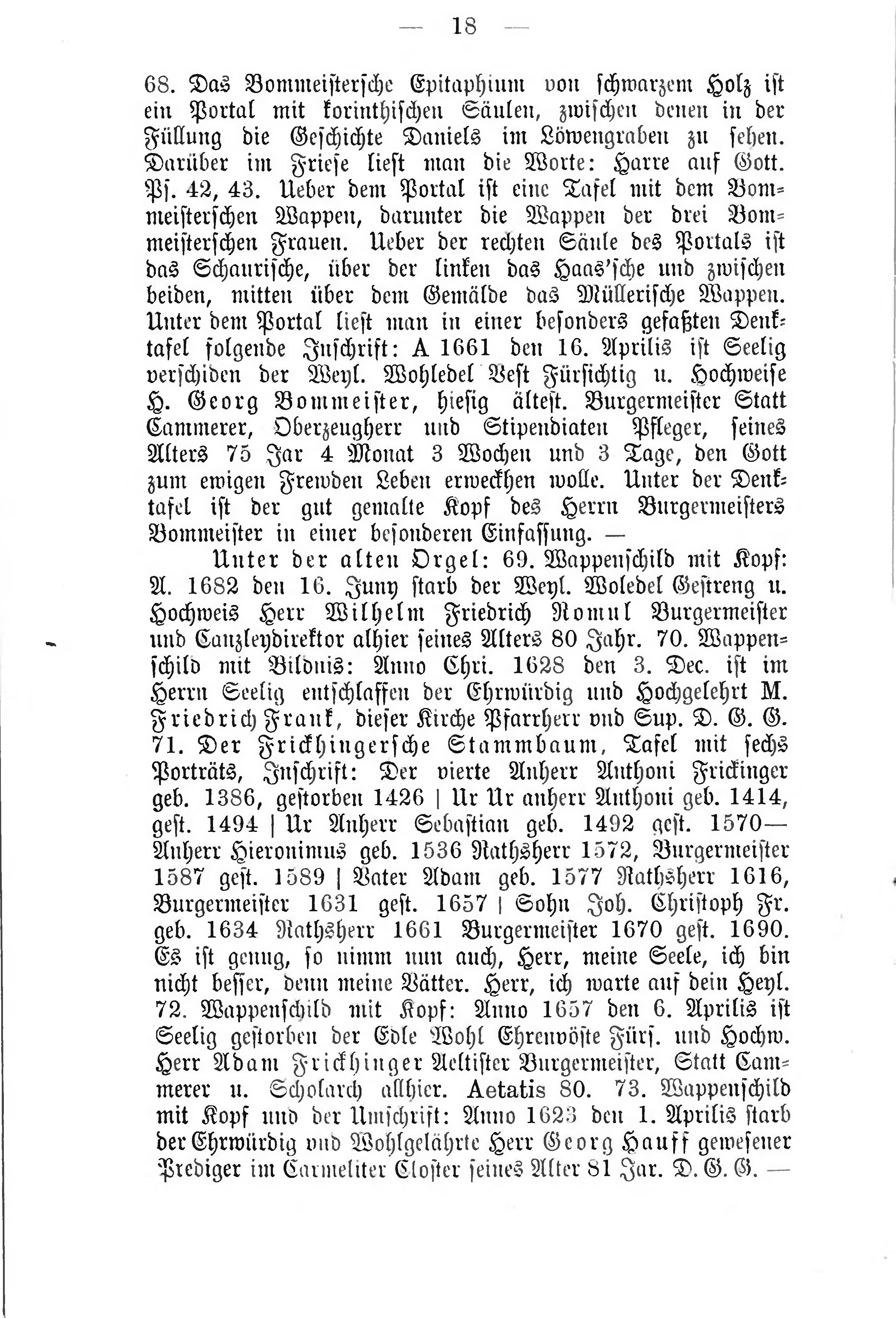 68. Das Bommeistersche Epitaphium von schwarzem Holz ist ein Portal mit korinthischen Säulen, zwischen denen in der Füllung die Geschichte Daniels im Löwengraben zu sehen. Darüber im Friese liest man die Worte: Harre auf Gott. Ps. 42, 43. Ueber dem Portal ist eine Tafel mit dem Bommeisterschen Wappen, darunter die Wappen der drei Bommeisterschen Frauen. Ueber der rechten Säule des Portals ist das Schaurische, über der linken das Haas’sche und zwischen beiden, mitten über dem Gemälde das Müllerische Wappen. Unter dem Portal liest man in einer besonders gefaßten Denktafel folgende Inschrift: A 1661 den 16. Aprilis ist Seelig verschiden der Weyl. Wohledel Vest Fürsichtig u. Hochweise H. Georg Bommeister, hiesig ältest. Burgermeister Statt Cammerer, Oberzeugherr und Stipendiaten Pfleger, seines Alters 75 Jar 4 Monat 3 Wochen und 3 Tage, den Gott zum ewigen Frewden Leben erweckhen wolle. Unter der Denktafel ist der gut gemalte Kopf des Herrn Burgermeisters Bommeister in einer besonderen Einfassung. –