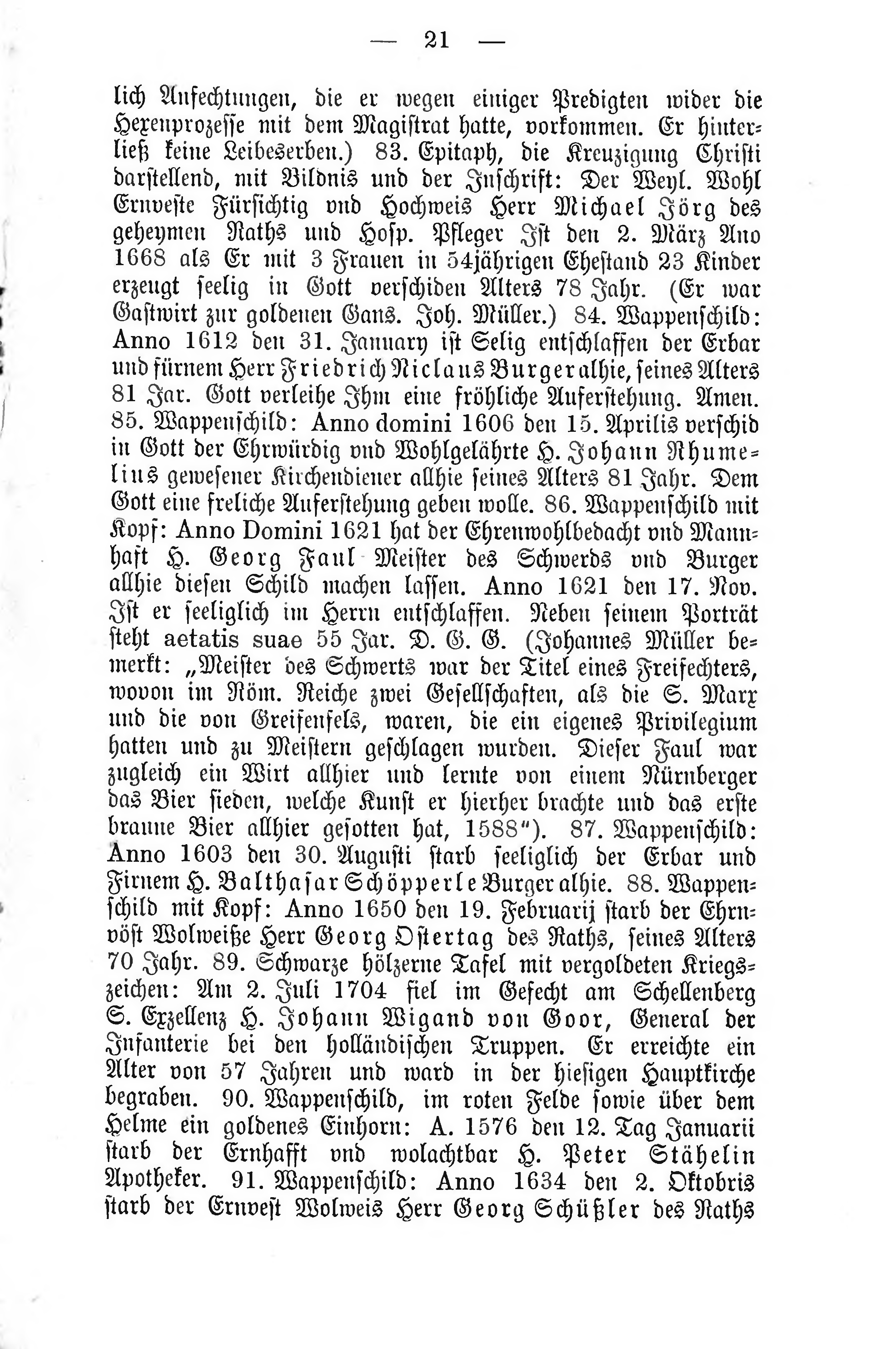 Anfechtungen, die er wegen einiger Predigten wider die Hexenprozesse mit dem Magistrat hatte, vorkommen. Er hinterließ keine Leibeserben.) 83. Epitaph, die Kreuzigung Christi darstellend, mit Bildnis und der Inschrift: Der Weyl. Wohl Ernveste Fürsichtig und Hochweis Herr Michael Jörg des geheymen Raths und Hofv. Pfleger Ist den 2. März Ano 1668 als Er mit 3 Frauen in 54jährigen Ehestand 23 Kinder erzeugt seelig in Gott verschiden Alters 78 Jahr. (er war Gastwirt zur goldenen Gans. Joh. Müller.) 84. Wappenschild: Anno 1612 den 31. January ist Selig entschlaffen der Erbar und fürnem Herr Friedrich Niclaus Burger alhie, seines Alters 81 Jar. Gott verleihe Ihm eine fröhliche Auferstehung. Amen. 85. Wappenschild: Anno domini 1606 den 15. Aprilis verschid in Gott der Ehrwürdig und Wohlgelährte H. Johann Rhumelins gewesener Kirchendiener allhie seines Alters 81 Jahr. Dem Gott eine freliche Auferstehung geben wolle. 86. Wappenschild mit Kopf: Anno Domini 1621 hat der Ehrenwohlbedacht und Mannhaft H. Georg Faul Meister des Schwerds und Burger allhie diesen Schild machen lassen. Anno 1621 den 17. Nov. Ist er seeliglich im Herrn entschlaffen. Neben seinem Porträt steht aetatis suae 55 Jar. D. G. G. (Johannes Müller bemerkt: „Meister des Schwerts war der Titel eines Freifechters, wovon im Röm. Reiche zwei Gesellschaften, als die S. Marx und die von Greifenfels, waren, die ein eigenes Privilegium hatten und zu Meistern geschlagen wurden. Dieser Faul war zugleich ein Wirt allhier und lernte von einem Nürnberger das Bieer sieden, welche Kunst er hierher brachte und das erste braune Bier allhier gesotten hat, 1588“). 87. Wappenschild: Anno 1603 den 30. Augusti starb seeliglich der Erbar und Firnem H. Balthasar Schöpperle Burger alhie. 88. Wappenschild mit Kopf: Anno 1650 den 19. Februarij starb der Ehrnvöst Wolweiße Herr Georg Ostertag des Raths, seines Alters 70 Jahr. 89. Schwarze hölzerne Tafel mit vergoldeten Kriegszeichen: Am 2. Juli 1704 fiel im Gefecht am Schellenberg S. Exzellenz H. Johann Wigand von Goor, General der Infanterie bei den holländischen Truppen. Er erreichte ein Alter von 57 Jahren und ward in der hiesigen Hauptkirche begraben. 90. Wappenschild, im roten Felde sowie über dem Helme ein goldenes Einhorn: A. 1576 den 12. Tag Januarii starb der Ernhafft und wolachtbar H. Peter Stähelin Apotheker. 91. Wappenschild: Anno 1634 den 2. Oktobris starb der Ernvest Wolweis Herr Georg Schüßler des Raths