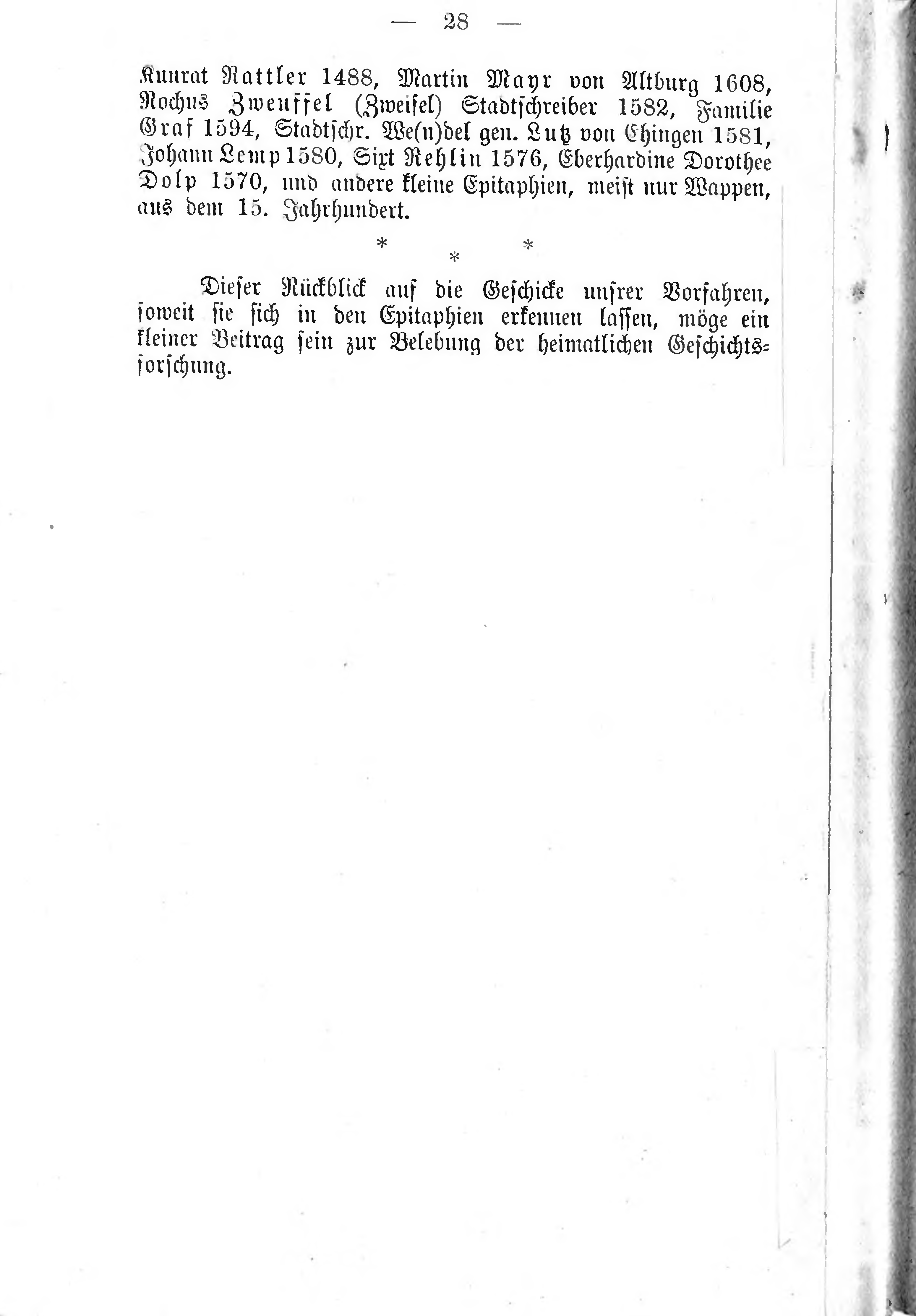 Dieser Rückblick auf die Geschicke unsrer Vorfahren, soweit sie sich in den Epitaphien erkennen lassen, möge ein kleiner Beitrag sein zur Belebung der heimatlichen Geschichtsforschung.