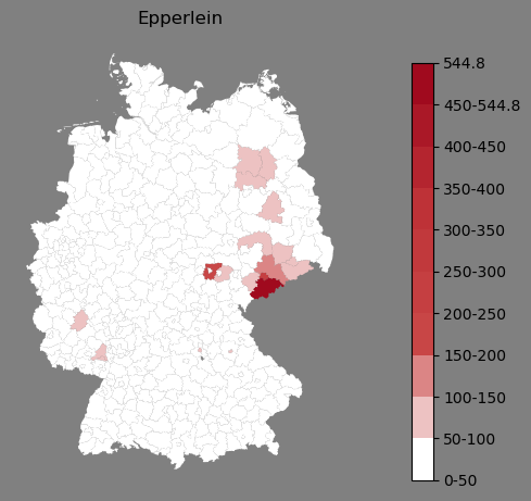 Absolute Verteilung des Namens Epperlein (1890)Direkt zur Karte Absolute Verteilung des Namens "Epperlein" um 1890 im damaligen Deutschen Reich Sie können die Karte innerhalb des Fensters zoomen und verschieben. |