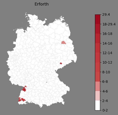 Relative Verteilung des Namens Erforth (1996)Direkt zur Karte Die Farbskala zeigt die Anzahl von "Erforth" bezogen auf je 1 Million Einträge. |