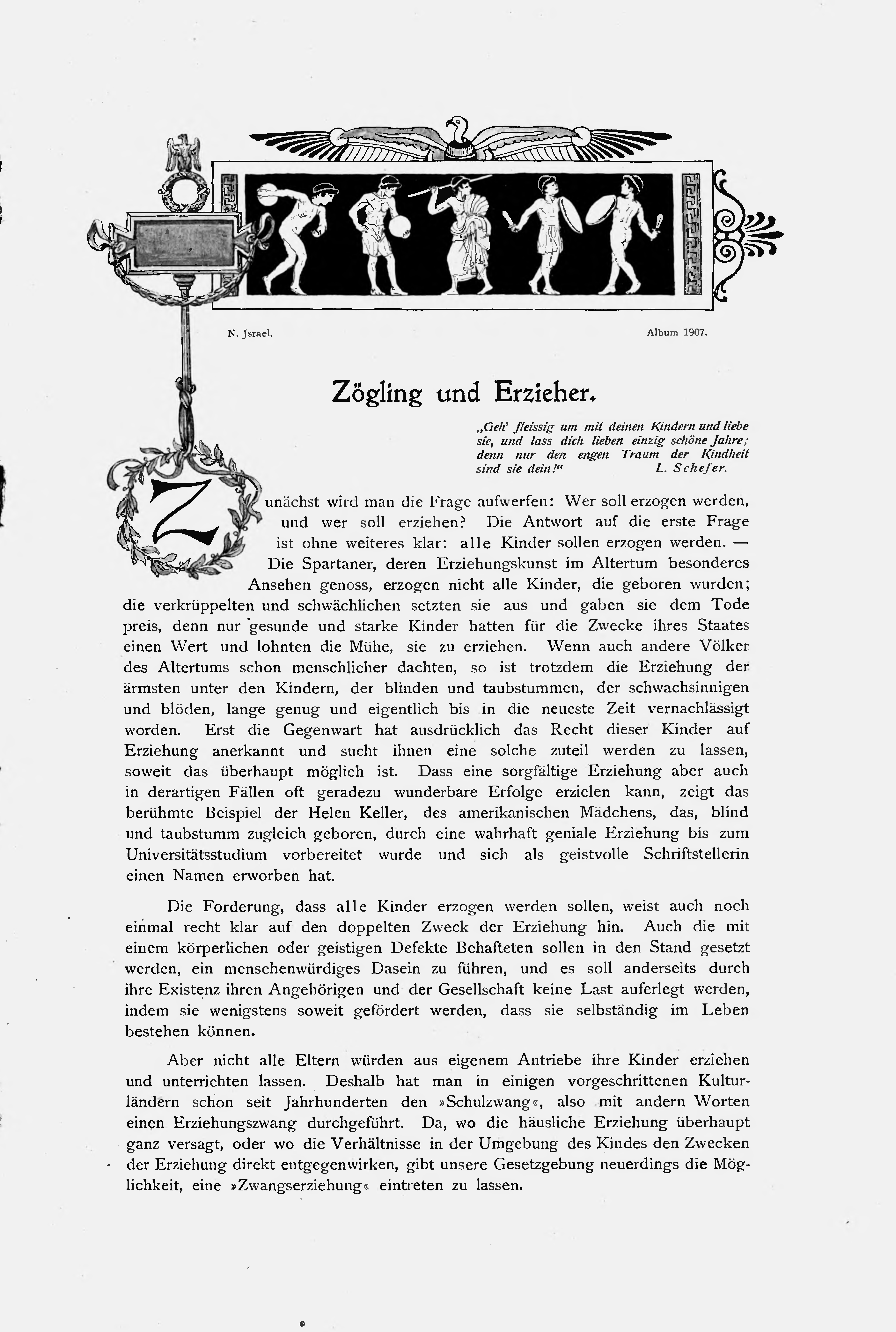Die Spartaner, deren Erziehungskunst im Altertum besonderes Ansehen genoss, erzogen nicht alle Kinder, die geboren wurden; die verkrüppelten und schwächlichen setzten sie aus und gaben sie dem Tode preis, denn nur gesunde und starke Kinder hatten für die Zwecke ihres Staates einen Wert und lohnten die Mühe, sie zu erziehen. Wenn auch andere Völker des Altertums schon menschlicher dachten, so ist trotzdem die Erziehung der ärmsten unter den Kindern, der blinden und taubstummen, der schwachsinnigen und blöden, lange genug und eigentlich bis in die neueste Zeit vernachlässigt worden. Erst die Gegenwart hat ausdrücklich das Recht dieser Kinder auf Erziehung anerkannt und sucht ihnen eine solche zuteil werden zu lassen, soweit das überhaupt möglich ist. Dass eine sorgfältige Erziehung aber auch in derartigen Fällen oft geradezu wunderbare Erfolge erzielen kann, zeigt das berühmte Beispiel der Helen Keller, des amerikanischen Mädchens, das, blind und taubstumm zugleich geboren, durch eine wahrhaft geniale Erziehung bis zum Universitätsstudium vorbereitet wurde und sich als geistvolle Schriftstellerin einen Namen erworben hat.