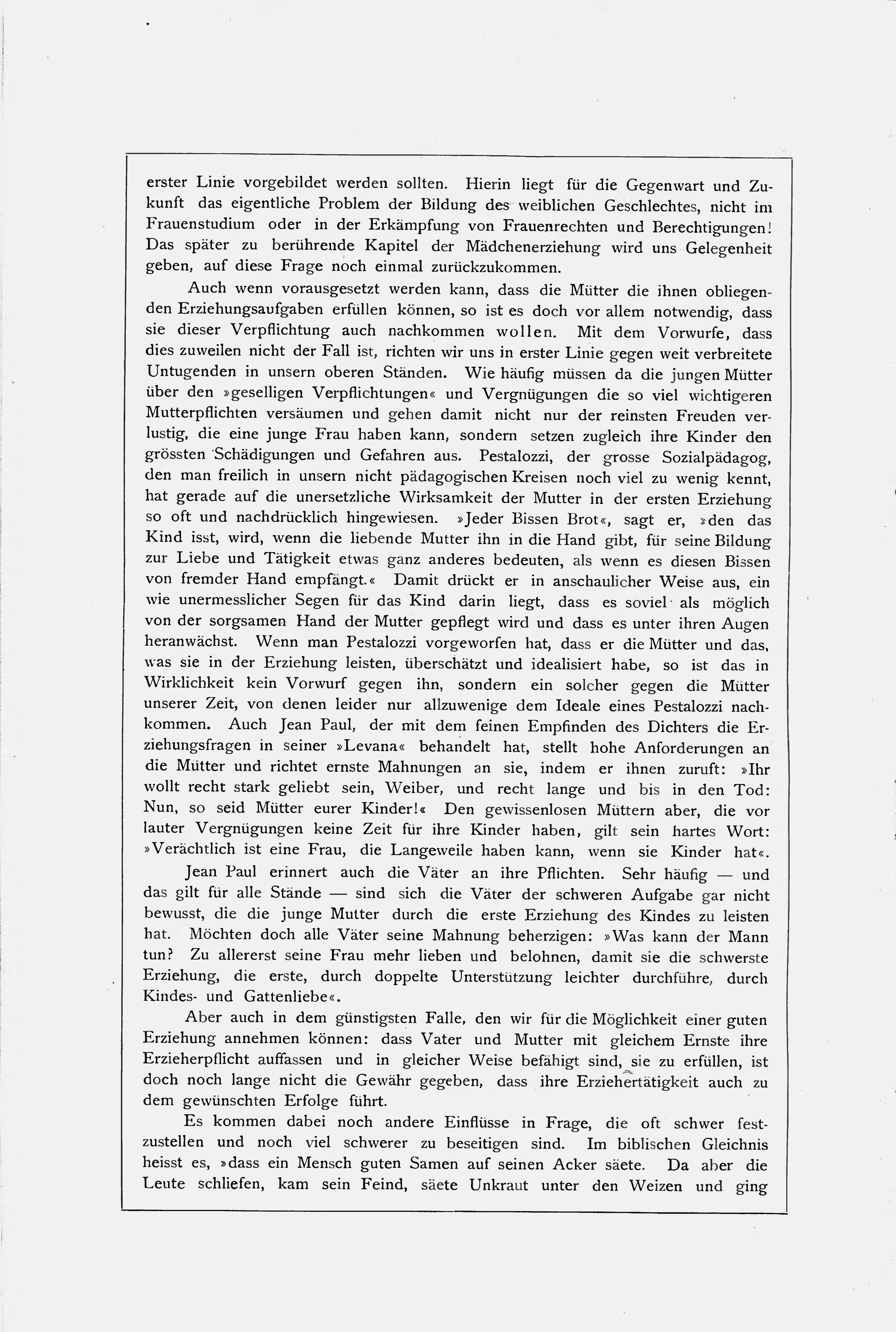Auch wenn vorausgesetzt werden kann, dass die Mütter die ihnen obliegenden Erziehungsaufgaben erfüllen können, so ist es doch vor allem notwendig, dass sie dieser Verpflichtung auch nachkommen wollen. Mit dem Vorwurfe, dass dies zuweilen nicht der Fall ist, richten wir uns in erster Linie gegen weit verbreitete Untugenden in unsern oberen Ständen. Wie häufig müssen da die jungen Mütter über den »geselligen Verpflichtungen« und Vergnügungen die so viel wichtigeren Mutterpflichten versäumen und gehen damit nicht nur der reinsten Freuden verlustig, die eine junge Frau haben kann, sondern setzen zugleich ihre Kinder den grössten Schädigungen und Gefahren aus. Pestalozzi, der grosse Sozialpädagog, den man freilich in unsern nicht pädagogischen Kreisen noch viel zu wenig kennt, hat gerade auf die unersetzliche Wirksamkeit der Mutter in der ersten Erziehung so oft und nachdrücklich hingewiesen. »Jeder Bissen Brot«, sagt er, »den das Kind isst, wird, wenn die liebende Mutter ihn in die Hand gibt, für seine Bildung zur Liebe und Tätigkeit etwas ganz anderes bedeuten, als wenn es diesen Bissen von fremder Hand empfängt.« Damit drückt er in anschaulicher Weise aus, ein wie unermesslicher Segen für das Kind darin liegt, dass es soviel' als möglich von der sorgsamen Hand der Mutter gepflegt wird und dass es unter ihren Augen heranwächst. Wenn man Pestalozzi vorgeworfen hat, dass er die Mütter und das, was sie in der Erziehung leisten, überschätzt und idealisiert habe, so ist das in Wirklichkeit kein Vorwurf gegen ihn, sondern ein solcher gegen die Mütter unserer Zeit, von denen leider nur allzuwenige dem Ideale eines Pestalozzi nachkommen. Auch Jean Paul, der mit dem feinen Empfinden des Dichters die Erziehungsfragen in seiner »Levana« behandelt hat, stellt hohe Anforderungen an die Mütter und richtet ernste Mahnungen an sie, indem er ihnen zuruft: »Ihr wollt recht stark geliebt sein, Weiber, und recht lange und bis in den Tod: Nun, so seid Mütter eurer Kinder!« Den gewissenlosen Müttern aber, die vor lauter Vergnügungen keine Zeit für ihre Kinder haben, gilt sein hartes Wort: »Verächtlich ist eine Frau, die Langeweile haben kann, wenn sie Kinder hat«. Jean Paul erinnert auch die Väter an ihre Pflichten. Sehr häufig — und das gilt für alle Stände — sind sich die Väter der schweren Aufgabe gar nicht bewusst, die die junge Mutter durch die erste Erziehung des Kindes zu leisten hat. Möchten doch alle Väter seine Mahnung beherzigen: »Was kann der Mann tun? Zu allererst seine Frau mehr lieben und belohnen, damit sie die schwerste Erziehung, die erste, durch doppelte Unterstützung leichter durchführe, durch Kindes- und Gattenliebe«.