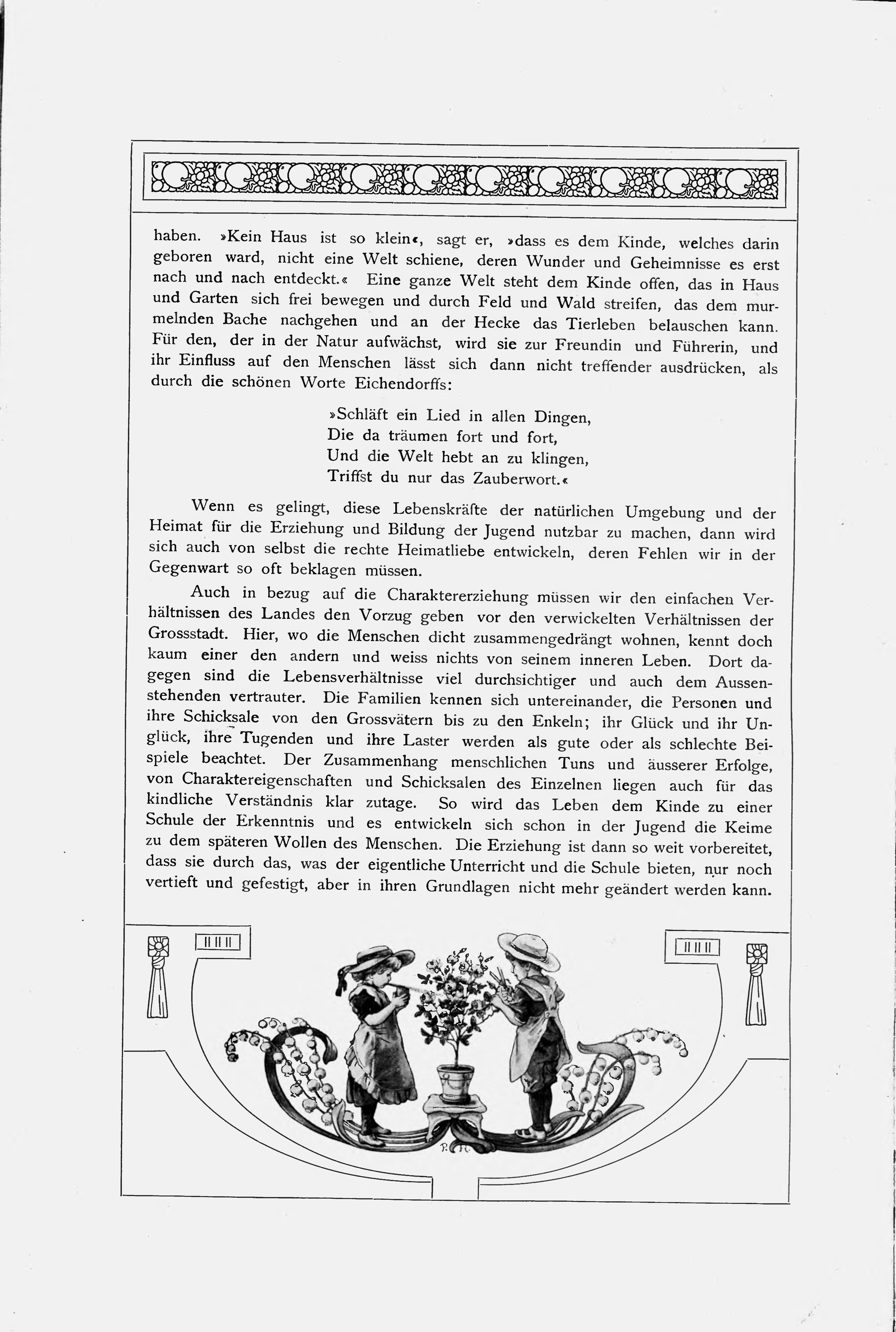 und Garten sich frei bewegen und durch Feld und Wald streifen, das dem murmelnden Bache nachgehen und an der Hecke das Tierleben belauschen kann.