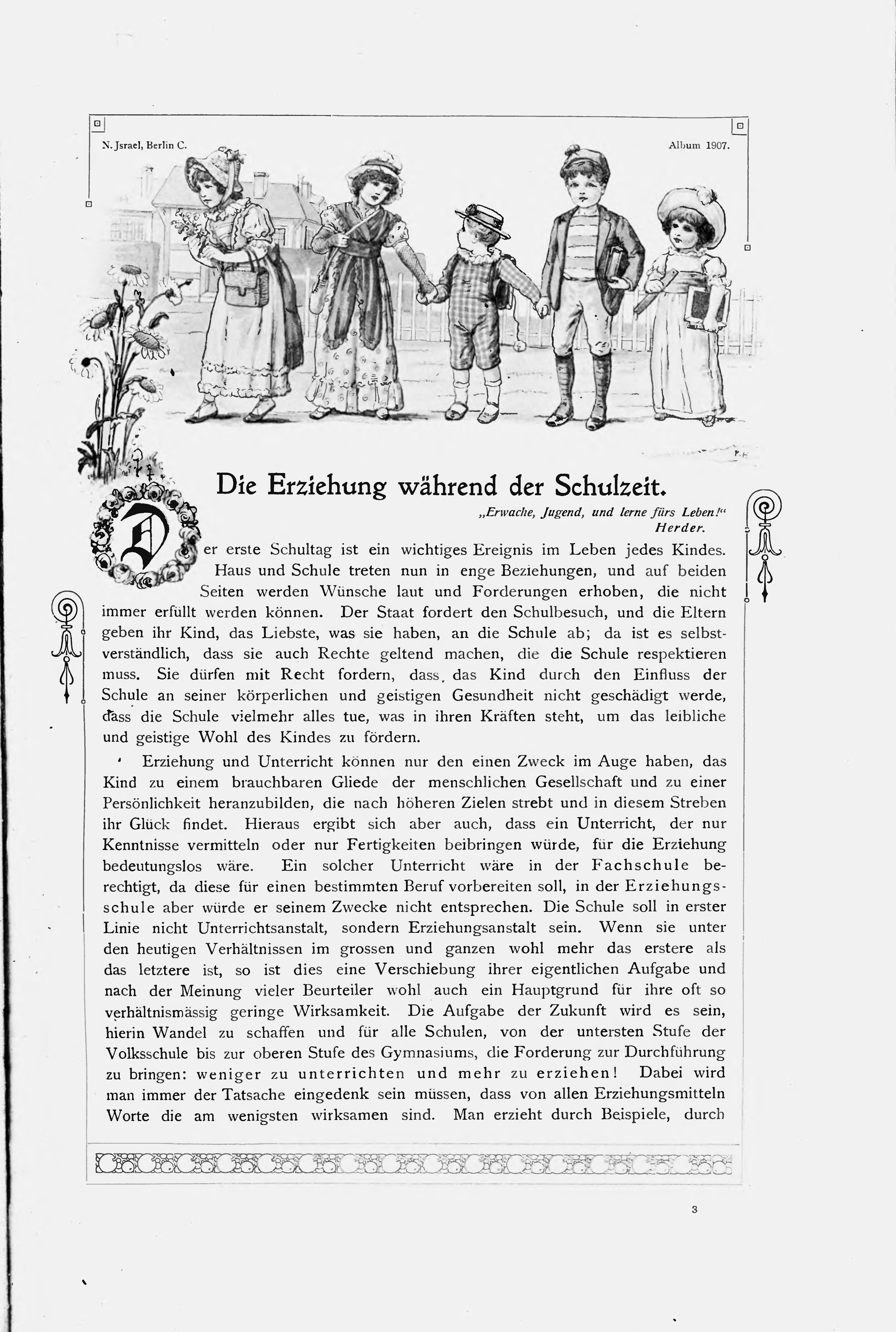 Der erste Schultag ist ein wichtiges Ereignis im Leben jedes Kindes. Haus und Schule treten nun in enge Beziehungen, und auf beiden Seiten werden Wünsche laut und Forderungen erhoben, die nicht immer erfüllt werden können. Der Staat fordert den Schulbesuch, und die Eltern geben ihr Kind, das Liebste, was sie haben, an die Schule ab; da ist es selbstverständlich, dass sie auch Rechte geltend machen, die die Schule respektieren muss. Sie dürfen mit Recht fordern, dass das Kind durch den Einfluss der Schule an seiner körperlichen und geistigen Gesundheit nicht geschädigt werde, dass die Schule vielmehr alles tue, was in ihren Kräften steht, um das leibliche und geistige Wohl des Kindes 7.11 fördern.