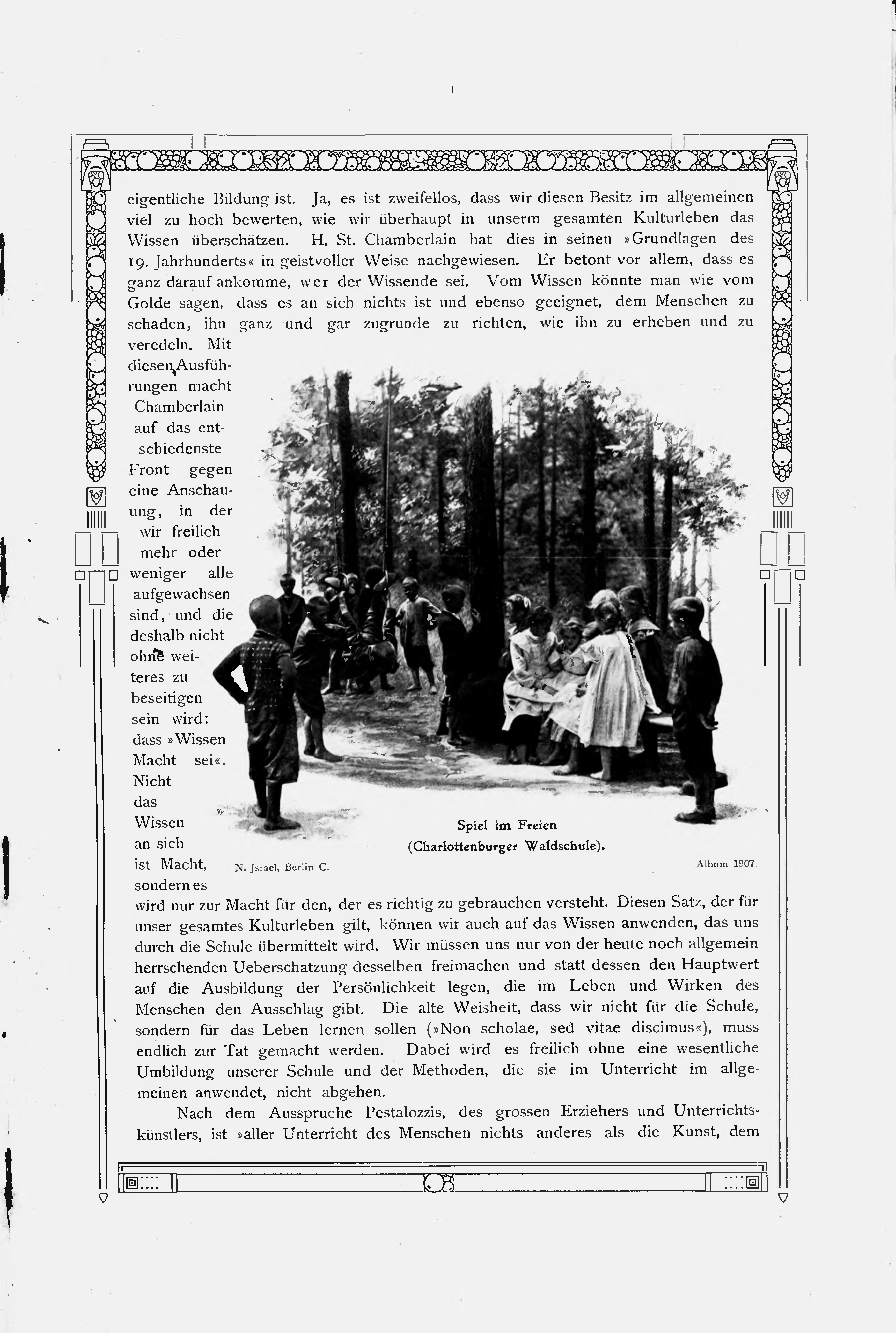 wird nur zur Macht für den, der es richtig zu gebrauchen versteht. Diesen Satz, der für unser gesamtes Kulturleben gilt, können wir auch auf das Wissen anwenden, das uns durch die Schule übermittelt wird. Wir müssen uns nur von der heute noch allgemein herrschenden Ueberschatzung desselben freimachen und statt dessen den Hauptwert auf die Ausbildung der Persönlichkeit legen, die im Leben und Wirken des Menschen den Ausschlag gibt. Die alte Weisheit, dass wir nicht für die Schule, sondern für das Leben lernen sollen (»Non scholae, sed vitae discimus«), muss endlich zur Tat gemacht werden. Dabei wird es freilich ohne eine wesentliche Umbildung unserer Schule und der Methoden, die sie im Unterricht im allge- meinen anwendet, nicht abgehen.