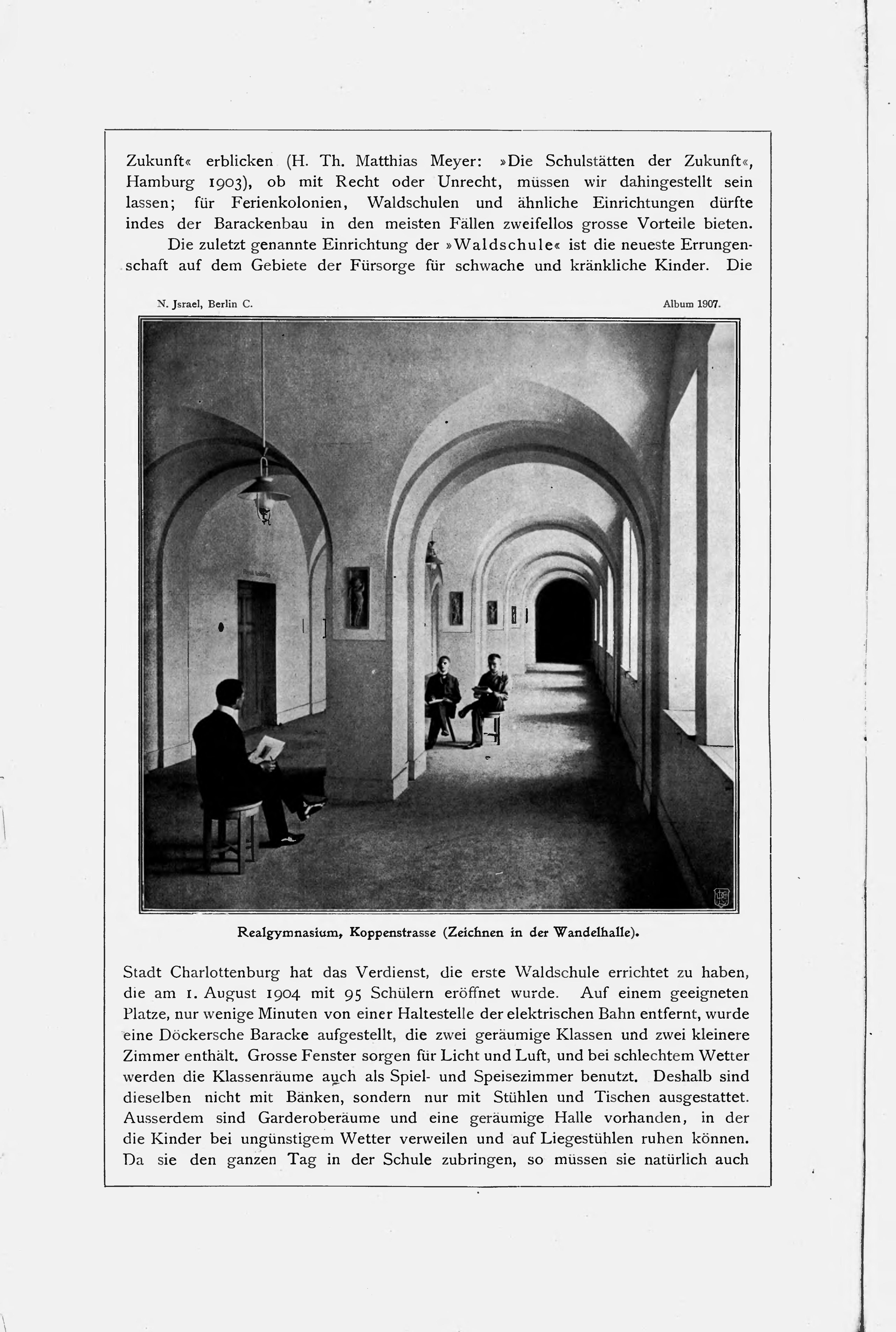 Zukunft« erblicken (H. Th. Matthias Meyer: »Die Schulstätten der Zukunft«, Hamburg 1903), ob mit Recht oder Unrecht, müssen wir dahingestellt sein lassen; für Ferienkolonien, Waldschulen und ähnliche Einrichtungen dürfte indes der Barackenbau in den meisten Fällen zweifellos grosse Vorteile bieten. Die zuletzt genannte Einrichtung der »Waldschule« ist die neueste Errungenschaft auf dem Gebiete der Fürsorge für schwache und kränkliche Kinder. Die Stadt Charlottenburg hat das Verdienst, die erste Waldschule errichtet zu haben, die am I. August 1904 mit 95 Schülern eröffnet wurde. Auf einem geeigneten Platze, nur wenige Minuten von einer Haltestelle der elektrischen Bahn entfernt, wurde eine Döckersche Baracke aufgestellt, die zwei geräumige Klassen und zwei kleinere Zimmer enthält. Grosse Fenster sorgen für Licht und Luft, und bei schlechtem Wetter werden die Klassenräume auch als Spiel- und Speisezimmer benutzt. Deshalb sind dieselben nicht mit Bänken, sondern nur mit Stühlen und Tischen ausgestattet. Ausserdem sind Garderoberäume und eine geräumige Halle vorhanden, in der die Kinder bei ungünstigem Wetter verweilen und auf Liegestühlen ruhen können. Da sie den ganzen Tag in der Schule zubringen, so müssen sie natürlich auch