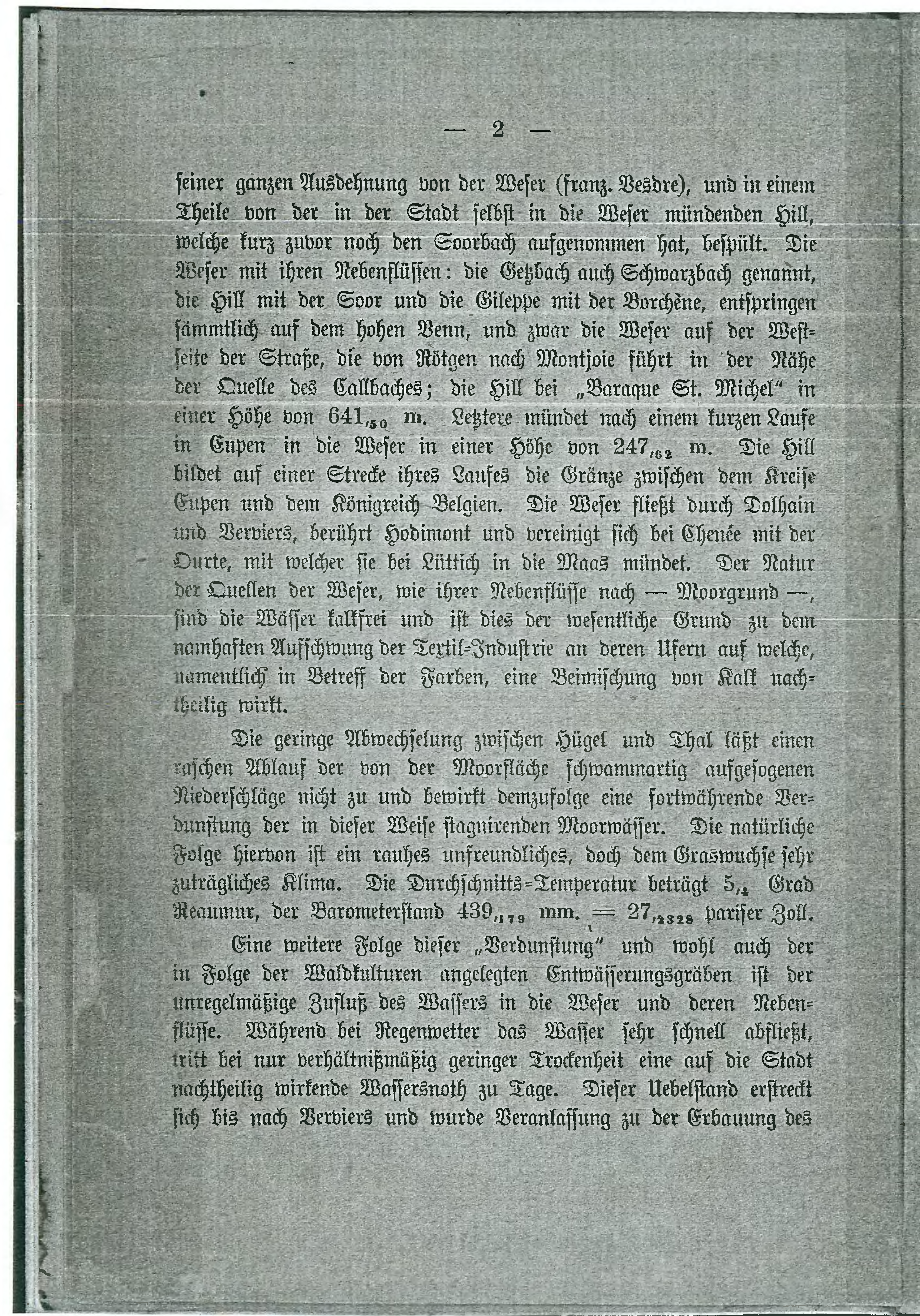 Eine weitere Folge dieser „Verdunstung“ und wohl auch der in Folge der Waldkulturen angelegten Entwässerungsgräben ist der unregelmäßige Zufluß des Wassers in die Weser und deren Nebenflüsse. Während bei Regenwetter das Wasser sehr schnell abfließt, tritt bei nur verhältnißmäßig geringer Trockenheit eine auf die Stadt nachtheilig wirkende Wassersnoth zu Tage. Dieser Uebelstand erstreckt sich bis nach Verviers und wurde Veranlassung zu der Erbauung des