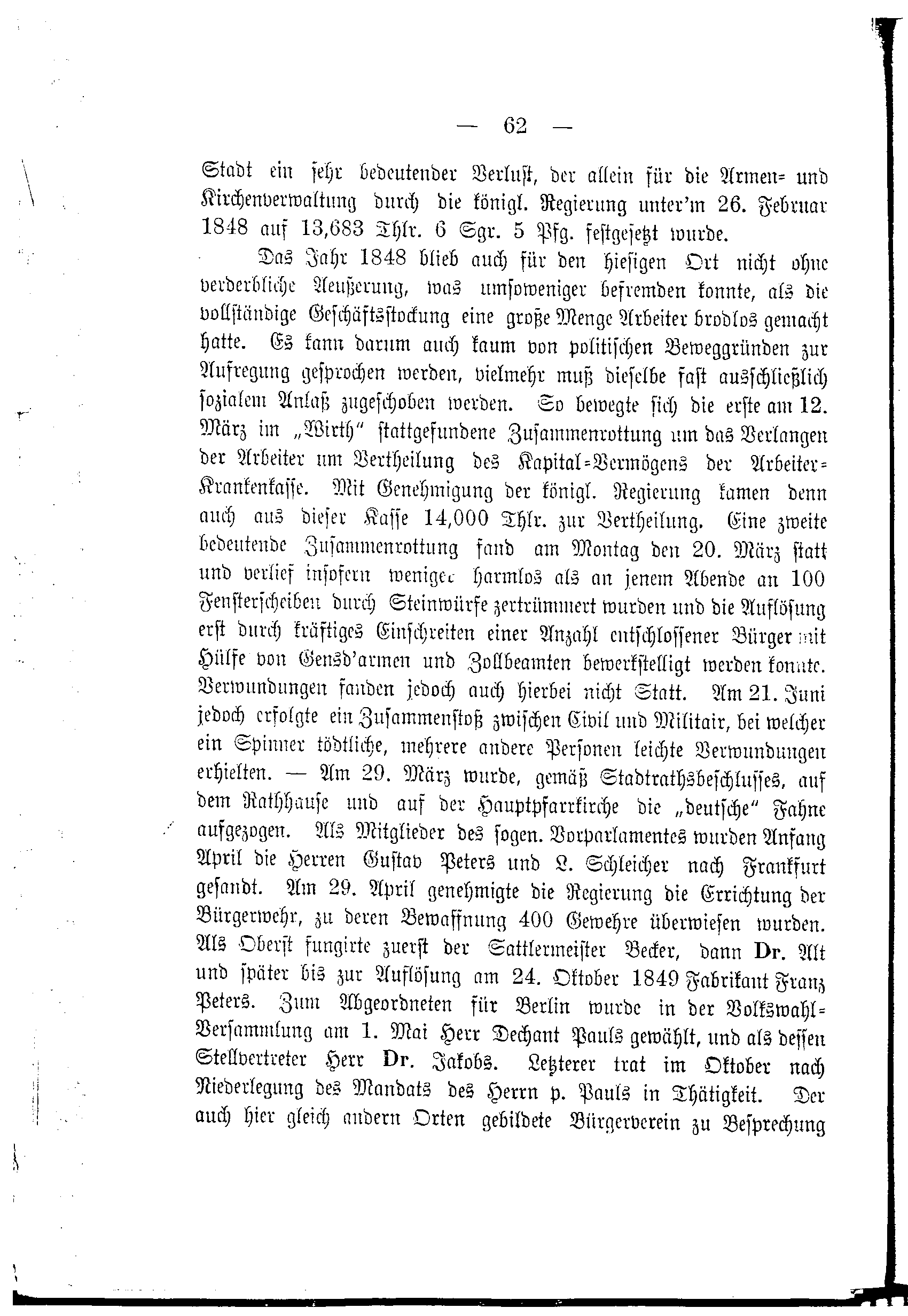 Das Jahr 1848 blieb auch für den hiesigen Ort nicht ohne verderbliche Aeußerung, was umsoweniger befremden konnte, als die vollständige Geschäftsstückung eine große Menge Arbeiter brodlos gemacht hatte. Es kann darum auch kaum von politischen Beweggründen zur Aufregung gesprochen werden, vielmehr muß dieselbe fast ausschließlich sozialem Anlaß zugeschoben werden. So bewegte sich die erste am 12. März im „Wirth“ stattgefundene Zusammenrottung um das Verlangen der Arbeiter um Vertheilung des Kapital-Vermögens der Arbeiter-Krankenkasse. Mit Genehmigung der königl. Regierung kamen denn auch aus dieser Kasse 14,000 Thlr. zur Vertheilung. Eine zweite bedeutende Zusammenrottung fand am Montag den 20. März statt und verlief insofern weniger harmlos als an jenem Abende an 100 Fensterscheiben durch Steinwürfe zertrümmert wurden und die Auflösung erst durch kräftiges Einschreiten einer Anzahl entschlossener Bürger mit Hülfe von Gensd'armen und Zollbeamten bewerkstelligt werden konnte. Verwundungen fanden jedoch auch hierbei nicht Statt. Am 21. Juni jedoch erfolgte ein Zusammenstoß zwischen Civil und Militair, bei welcher ein Spinner tödtliche, mehrere andere Personen leichte Verwundungen erhielten. — Am 29. März wurde, gemäß Stadtrathsbeschlusses, auf dem Rathhause und auf der Hauptpfarrkirche die „deutsche“ Fahne aufgezogen. Als Mitglieder des sogen. Vorparlamentes wurden Anfang April die Herren Gustav Peters und L. Schleicher nach Frankfurt gesandt. Am 29. April genehmigte die Regierung die Errichtung der Bürgerwehr, zu deren Bewaffnung 400 Gewehre überwiesen wurden. Als Oberst fungirte zuerst der Sattlermeister Becker, dann Dr. Alt und später bis zur Auflösung am 24. Oktober 1849 Fabrikant Franz Peters. Zum Abgeordneten für Berlin wurde in der Volkswahl-Versammlung am 1. Mai Herr Dechant Pauls gewählt, und als dessen Stellvertreter Herr Dr. Jakobs. Letzterer trat im Oktober nach Niederlegung des Mandats des Herrn p. Pauls in Thätigkeit. Der auch hier gleich andern Orten gebildete Bürgerverein zu Besprechung