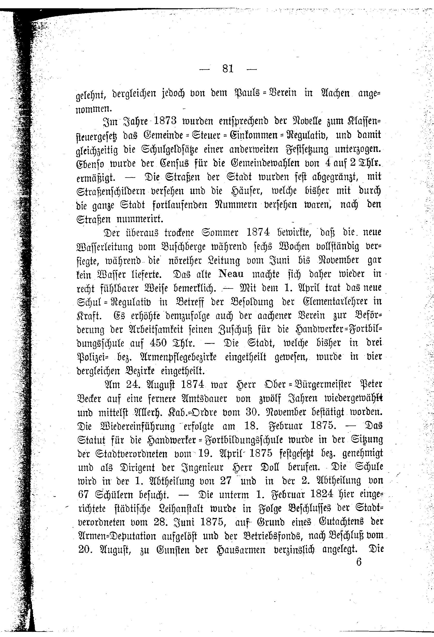 Der überaus trockene Sommer 1874 bewirkte, daß die neue Wasserleitung vom Buschberge während sechs Wochen vollständig versiegte, während die nörether Leitung vom Juni bis November gar kein Wasser lieferte. Das alte Neau machte sich daher wieder in recht fühlbarer Weise bemerklich. — Mit dem 1. April trat das neue Schul-Regulativ in Betreff der Besoldung der Elementarlehrer in Kraft. Es erhöhte demzufolge auch der aachener Verein zur Beförderung der Arbeitsamkeit seinen Zuschuß für die Handwerker-Fortbildungsschule auf 450 Thlr. — Die Stadt, welche bisher in drei Polizei- bez. Armenpflegebezirke eingetheilt gewesen, wurde in vier dergleichen Bezirke eingetheilt.