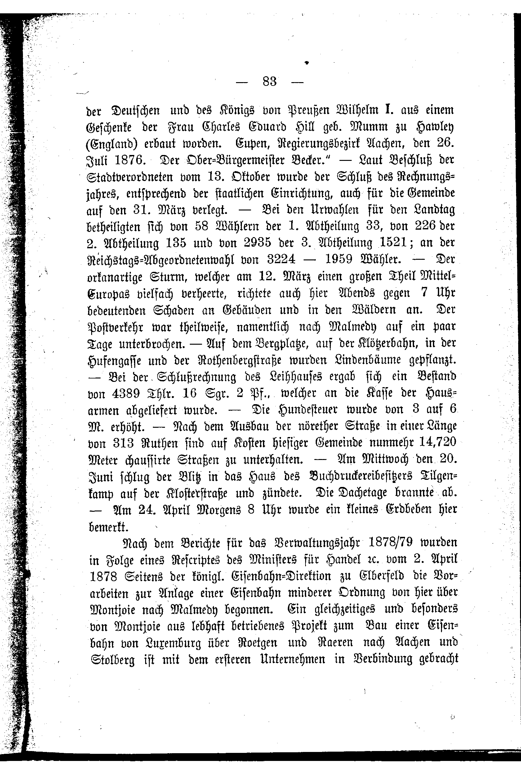 der Deutschen und des Königs von Preußen Wilhelm I. aus einem Geschenke der Frau Charles Eduard Hill geb. Mumm zu Hawley (England) erbaut worden. Eupen, Regierungsbezirk Aachen, den 26. Juli 1876. Der Ober-Bürgermeister Becker.“ — Laut Beschluß der Stadtverordneten vom 13. Oktober wurde der Schluß des Rechnungsjahres, entsprechend der staatlichen Einrichtung, auch für die Gemeinde auf den 31. März verlegt. — Bei den Urwahlen für den Landtag betheiligten sich von 58 Wählern der 1. Abtheilung 33, von 226 der 2. Abtheilung 135 und von 2935 der 3. Abtheilung 1521; an der Reichstags-Abgeordnetenwahl von 3224 — 1959 Wähler. — Der orkanartige Sturm, welcher am 12. März einen großen Theil Mittel-Europas vielfach verheerte, richtete auch hier Abends gegen 7 Uhr bedeutenden Schaden an Gebäuden und in den Wäldern an. Der Postverkehr war theilweise, namentlich nach Malmedy auf ein paar Tage unterbrochen. — Auf dem Bergplatze, auf der Klötzerbahn, in der Hufengasse und der Rothenbergstraße wurden Lindenbäume gepflanzt. — Bei der Schlußrechnung des Leihhauses ergab sich ein Bestand von 4389 Thlr. 16 Sgr. 2 Pf., welcher an die Kasse der Hausarmen abgeliefert wurde. — Die Hundesteuer wurde von 3 auf 6 M. erhöht. - Nach dem Ausbau der nörether Straße in einer Länge von 313 Ruthen sind auf Kosten hiesiger Gemeinde nunmehr 14,720 Meter chaussirte Straßen zu unterhalten. — Am Mittwoch den 20. Juni schlug der Blitz in das Haus des Buchdruckereibesitzers Tilgenkamp auf der Klosterstraße und zündete. Die Dachetage brannte ab. — Am 24. April Morgens 8 Uhr wurde ein kleines Erdbeben hier bemerkt.