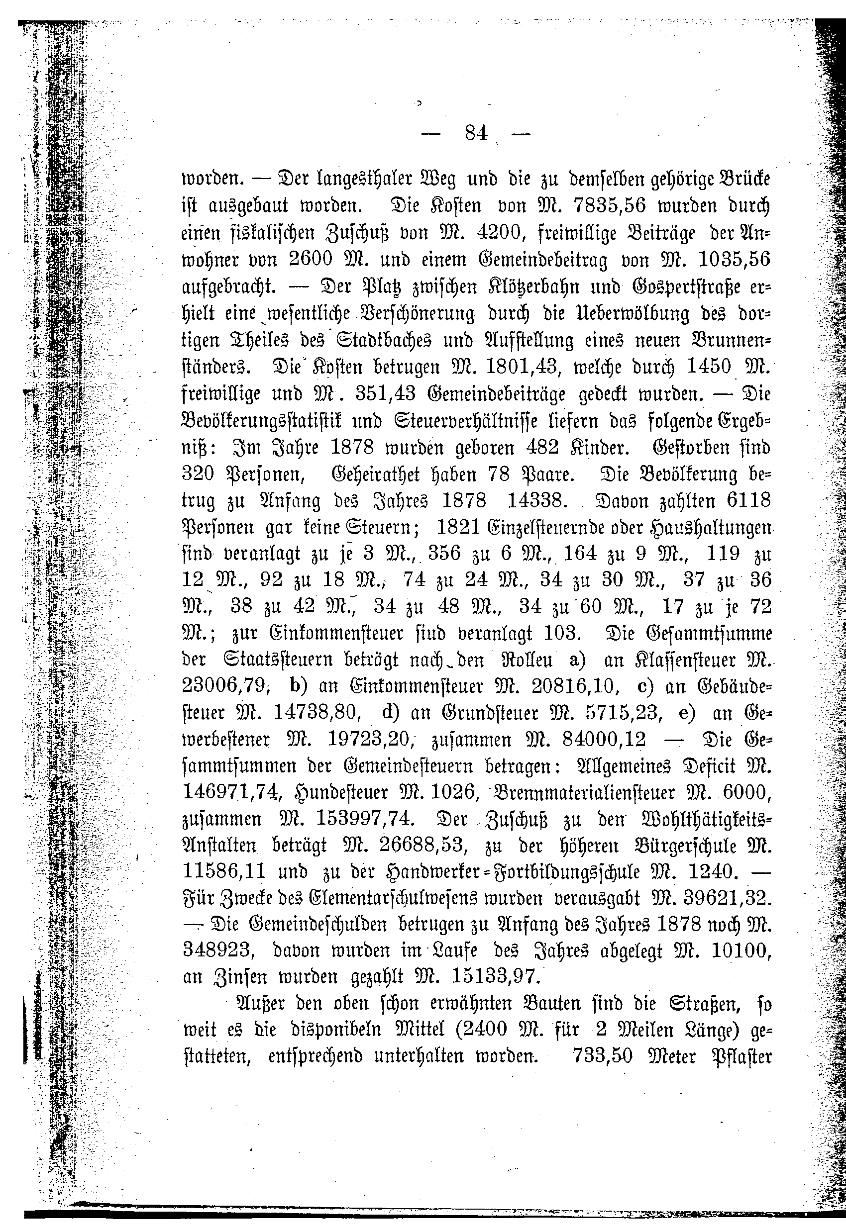 worden. — Der langesthaler Weg und die zu demselben gehörige Brücke ist ausgebaut worden. Die Kosten von M. 7835,56 wurden durch einen fiskalischen Zuschuß von M. 4200, freiwillige Beiträge der Anwohner von 2600 M. und einem Gemeindebeitrag von M. 1035,56 aufgebracht. — Der Platz zwischen Klötzerbahn und Gospertstraße erhielt eine wesentliche Verschönerung durch die Ueberwölbung des dortigen Theiles des Stadtbaches und Aufstellung eines neuen Brunnenständers. Die Kosten betrugen M. 1801,43, welche durch 1450 M. freiwillige und M. 351,43 Gemeindebeiträge gedeckt wurden. — Die Bevölkerungsstatistik und Steuerverhältnisse liefern das folgende Ergebniß: Im Jahre 1878 wurden geboren 482 Kinder. Gestorben sind 320 Personen, Geheirathet haben 78 Paare. Die Bevölkerung betrug zu Anfang des Jahres 1878 14338. Davon zahlten 6118 Personen gar keine Steuern; 1821 Einzelsteuernde oder Haushaltungen sind veranlagt zu je 3 M., 356 zu 6 M., 164 zu 9 M., 119 zu 12 M., 92 zu 18 M., 74 zu 24 M., 34 zu 30 M., 37 zu 36 M., 38 zu 42 M., 34 zu 48 M., 34 zu 60 M., 17 zu je 72 M.; zur Einkommensteuer sind veranlagt 103. Die Gesammtsumme der Staatssteuern beträgt nach den Rollen a) an Klassensteuer M. 23006,79, d) an Einkommensteuer M. 20816,10. c) an Gebäudesteuer M. 14738,80, d) an Grundsteuer M. 5715,23, e) an Gewerbesteuer M. 19723,20, zusammen M. 84000,12 — Die Gesammtsummen der Gemeindesteuern betragen: Allgemeines Deficit M. 146971,74. Hundesteuer M. 1026, Brennmaterialiensteuer M. 6000, zusammen M. 153997,74. Der Zuschuß zu den Wohlthätigkeits-Anstalten beträgt M. 26688,53, zu der höheren Bürgerschule M. 11586,11 und zu der Handwerker-Fortbildungsschule M. 1240. — Für Zwecke des Elementarschulwesens wurden verausgabt M. 39621,32. — Die Gemeindeschulden betrugen zu Anfang des Jahres 1878 noch M. 348923. davon wurden im Laufe des Jahres abgelegt M. 10100, an Zinsen wurden gezahlt M. 15133,97.