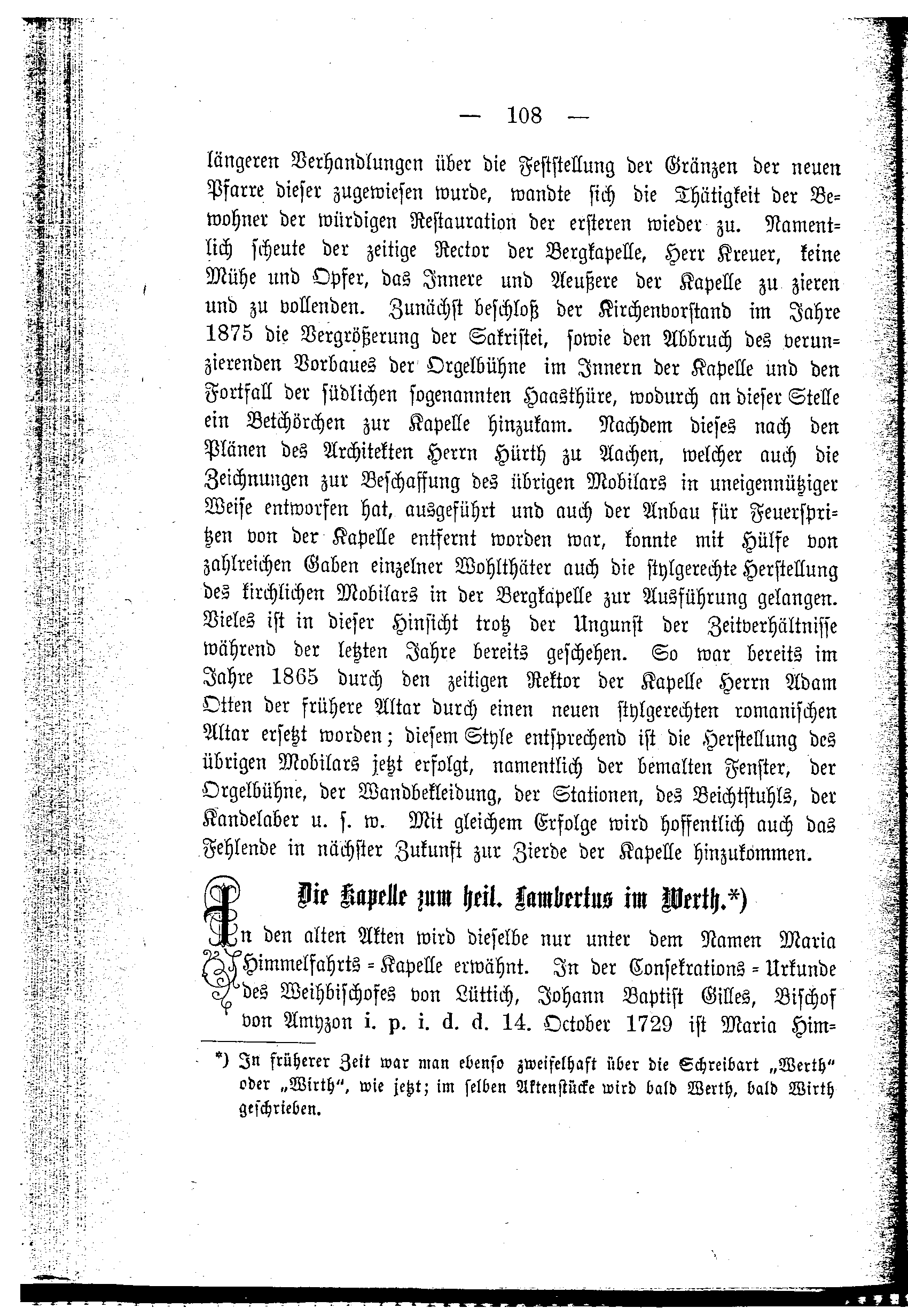 längeren Verhandlungen über die Feststellung der Gränzen der neuen Pfarre dieser zugewiesen wurde, wandte sich die Thätigkeit der Bewohner der würdigen Restauration der ersteren wieder zu. Namentlich scheute der zeitige Rector der Bergkapelle, Herr Kreuer, keine Mühe und Opfer, das Innere und Aeußere der Kapelle zu zieren und zu vollenden. Zunächst beschloß der Kirchenvorstand im Jahre 1875 die Vergrößerung der Sakristei, sowie den Abbruch des verunzierenden Vorbaues der Orgelbühne im Innern der Kapelle und den Fortfall der südlichen sogenannten Haasthüre, wodurch an dieser Stelle ein Betchörchen zur Kapelle hinzukam. Nachdem dieses nach den Plänen des Architekten Herrn Hürth zu Aachen, welcher auch die Zeichnungen zur Beschaffung des übrigen Mobilars in uneigennütziger Weise entworfen hat, ausgeführt und auch der Anbau für Feuerspritzen von der Kapelle entfernt worden war, konnte mit Hülfe von zahlreichen Gaben einzelner Wohlthäter auch die stylgerechte Herstellung des kirchlichen Mobilars in der Bergkapelle zur Ausführung gelangen. Vieles ist in dieser Hinsicht trotz der Ungunst der Zeitverhältnisse wählend der letzten Jahre bereits geschehen. So war bereits im Jahre 1865 durch den zeitigen Rektor der Kapelle Herrn Adam Otten der frühere Altar durch einen neuen stylgerechten romanischen Altar ersetzt worden; diesem Style entsprechend ist die Herstellung des übrigen Mobilars jetzt erfolgt, namentlich der bemalten Fenster, der Orgelbühne, der Wandbekleidung, der Stationen, des Beichtstuhls, der Kandelaber u.s.w. Mit gleichem Erfolge wird hoffentlich auch das Fehlende in nächster Zukunft zur Zierde der Kapelle hinzukommen.
