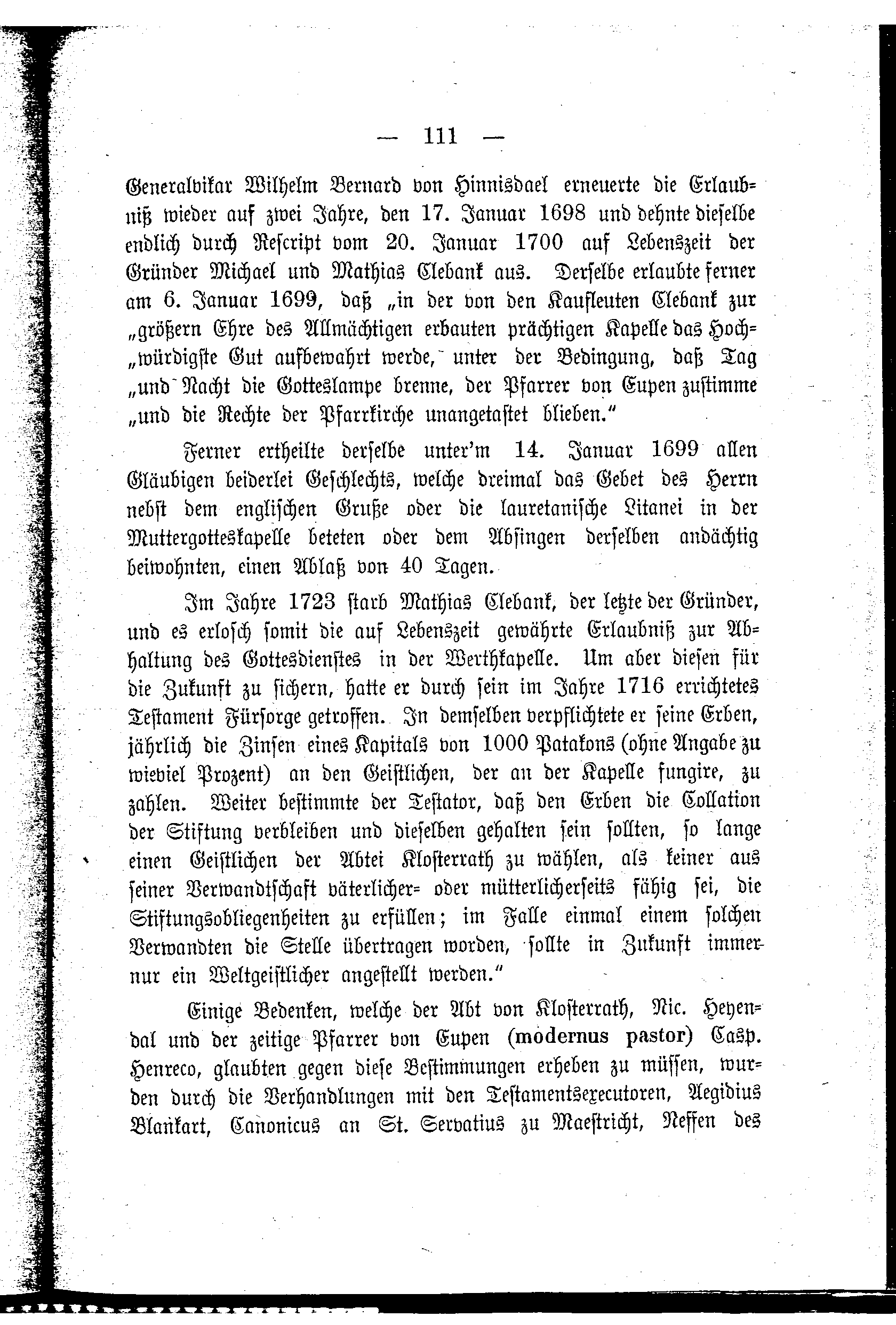 Im Jahre 1723 starb Mathias Clebank, der letzte der Gründer, und es erlosch somit die auf Lebenszeit gewährte Erlaubnis zur Abhaltung des Gottesdienstes in der Werthkapelle. Um aber diesen für die Zukunft zu sichern, hatte er durch sein im Jahre 1716 errichtetes Testament Fürsorge getroffen. In demselben verpflichtete er seine Erben, jährlich die Zinsen eines Kapitals von 1000 Patakons (ohne Angabe zu wieviel Prozent) an den Geistlichen, der an der Kapelle fungire, zu zahlen. Weiter bestimmte der Testator, daß den Erben die Collation der Stiftung verbleiben und dieselben gehalten sein sollten, so lange einen Geistlichen der Abtei Klosterrath zu wählen, als keiner aus seiner Verwandtschaft väterlicher- oder mütterlicherseits fähig sei, die Stiftungsobliegenheiten zu erfüllen; im Falle einmal einem solchen Verwandten die Stelle übertragen worden, sollte in Zukunft immer nur ein Weltgeistlicher angestellt werden.“