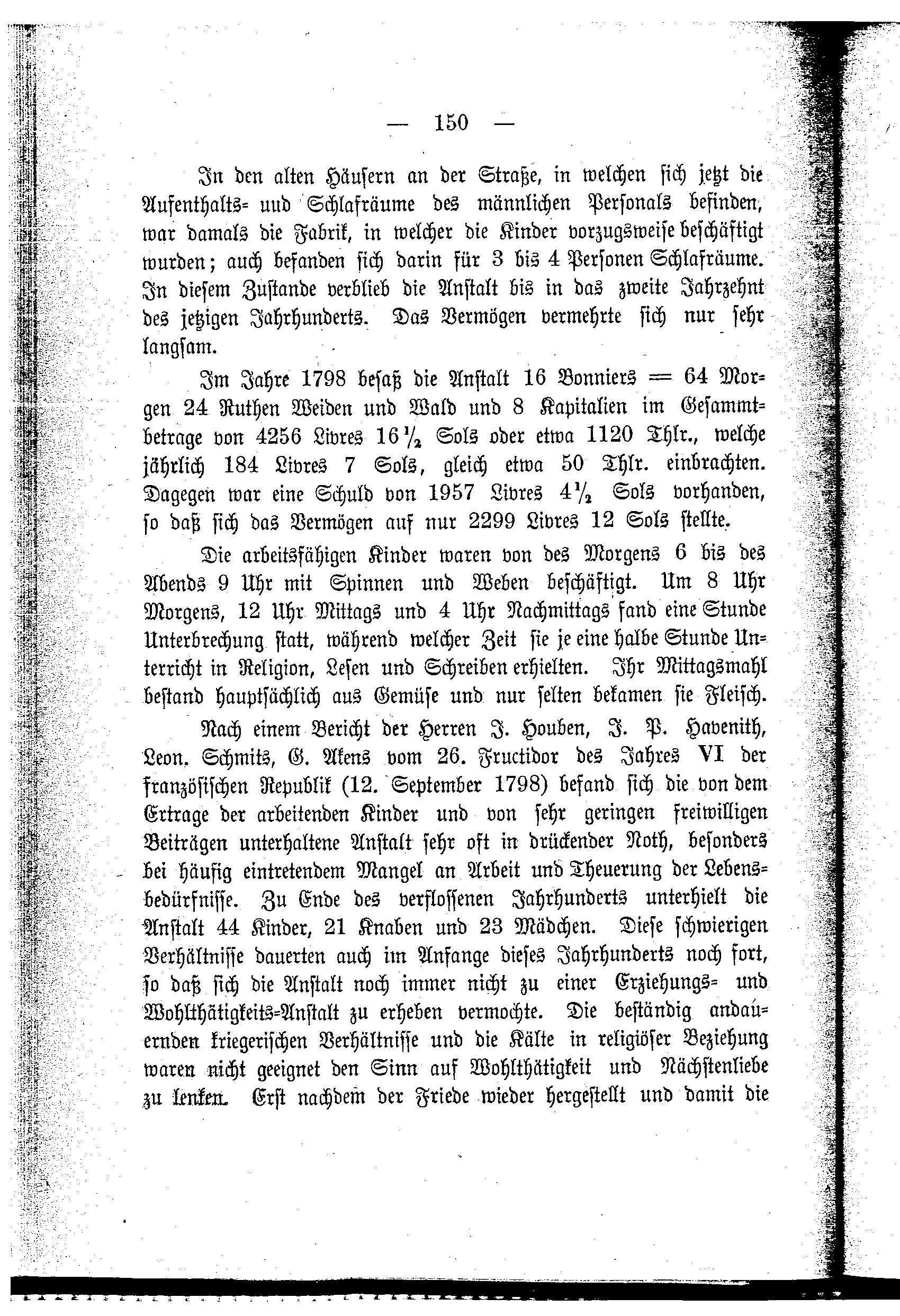 Nach einem Bericht der Herren J. Houben, J. P. Havenith, Leon. Schmits, G. Akens vom 26. Fructidor des Jahres VI der französischen Republik (12. September 1798) befand sich die von dem Ertrage der arbeitenden Kinder und von sehr geringen freiwilligen Beiträgen unterhaltene Anstalt sehr oft in drückender Noth, besonders bei häufig eintretendem Mangel an Arbeit und Theuerung der Lebensbedürfnisse. Zu Ende des verflossenen Jahrhunderts unterhielt die Anstalt 44 Kinder, 21 Knaben und 23 Mädchen. Diese schwierigen Verhältnisse dauerten auch im Anfange dieses Jahrhunderts noch fort, so daß sich die Anstalt noch immer nicht zu einer Erziehungs- und Wohlthätigkeits-Anstalt zu erheben vermochte. Die beständig andauernden kriegerischen Verhältnisse und die Kälte in religiöser Beziehung waren nicht geeignet den Sinn auf Wohlthätigkeit und Nächstenliebe zu lenken. Erst nachdem der Friede wieder hergestellt und damit die