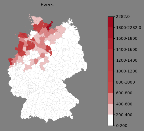 Relative Verteilung des Namens Evers (1996)Direkt zur Karte Die Farbskala zeigt die Anzahl von "Evers" bezogen auf je 1 Million Einträge. |