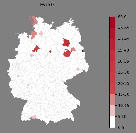 Relative Verteilung des Namens Everth (1996)Direkt zur Karte Die Farbskala zeigt die Anzahl von "Everth" bezogen auf je 1 Million Einträge. |
