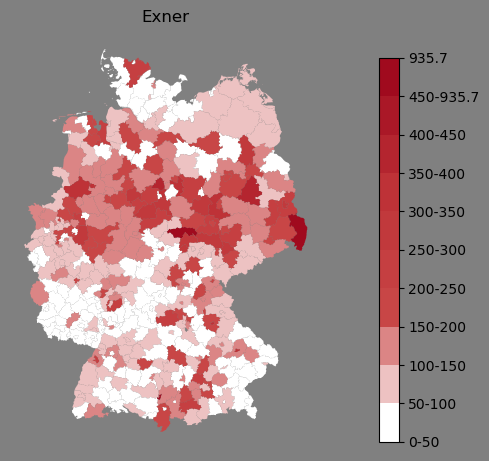 Absolute Verteilung des Namens Exner (1890)Direkt zur Karte Absolute Verteilung des Namens "Exner" um 1890 im damaligen Deutschen Reich Sie können die Karte innerhalb des Fensters zoomen und verschieben. |